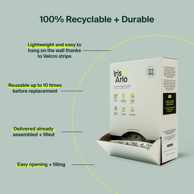 This dispenser comes pre-stocked with 48 of our Regular Tampons with applicator and is ideal for events or temporary facilities. It's lightweight, eco-conscious, and attached using 3M Velcro, perfect for flexible setups. At Iris + Arlo, we design with both people and planet in mind.