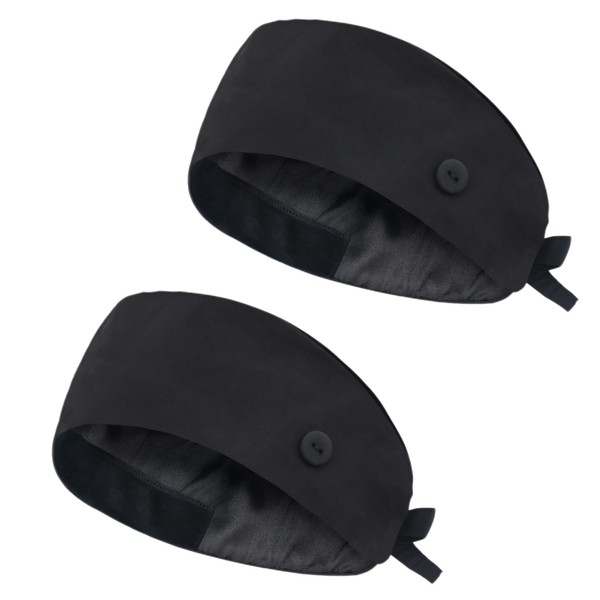 IRIS CRAFT Adjustable Working Cap with Button, Satin-Lined Cotton Working Hat Sweatband, Double Layer Elastic Bandage Tie Back Hats for Women & Men, One Size, 2 Pack: Black*2