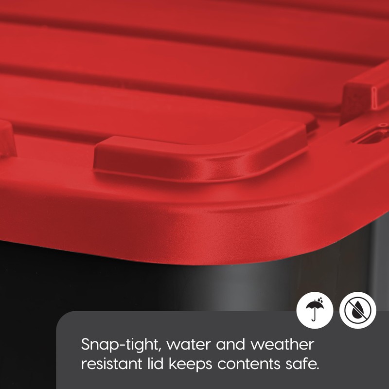 IRIS USA 12 Gallon Heavy Duty Truck Bed Toolbox Storage Tote Bins with Lids, 4 Pack - Made in USA, Tough Snap On Lid Stackable Industrial Rugged Tubs, Garage Organization, Reusable Box - Black/Red