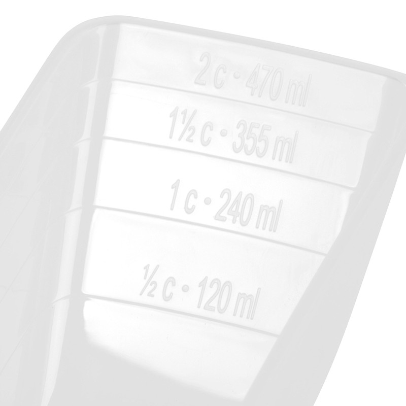 • Plastic scoop offers marks of ½ cup, 1 cup, 1½ cup, and 2 cup measurements