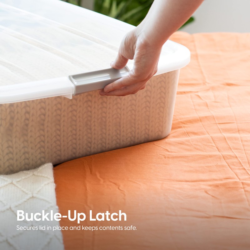 This under bed buckle up box is perfect for storing seasonal clothes, movies, and more. The clear lid and body allow you to easily identify the contents of each box. These boxes are designed to fit under most beds to help you utilize all of your storage space.