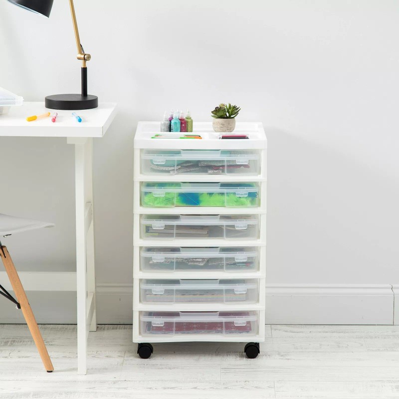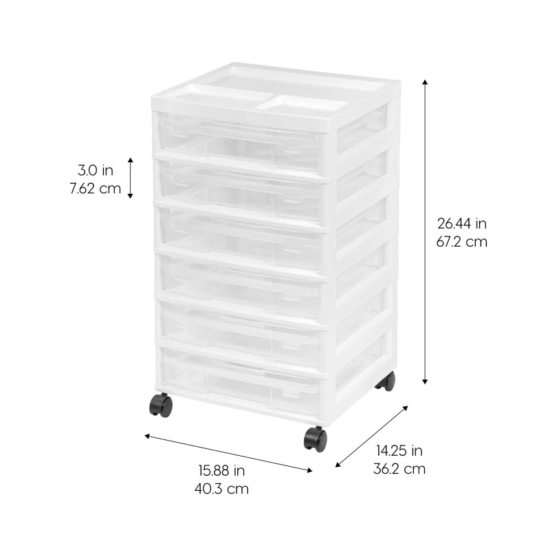 IRIS USA Fits 12" x 12" Paper, 6-Tier Scrapbook Rolling Storage Cart with Organizer Top for Papers Vinyl Tools Office Art and Craft Supplies, Yarn, White Frame with 6 Clear Cases w/ Built in Handle