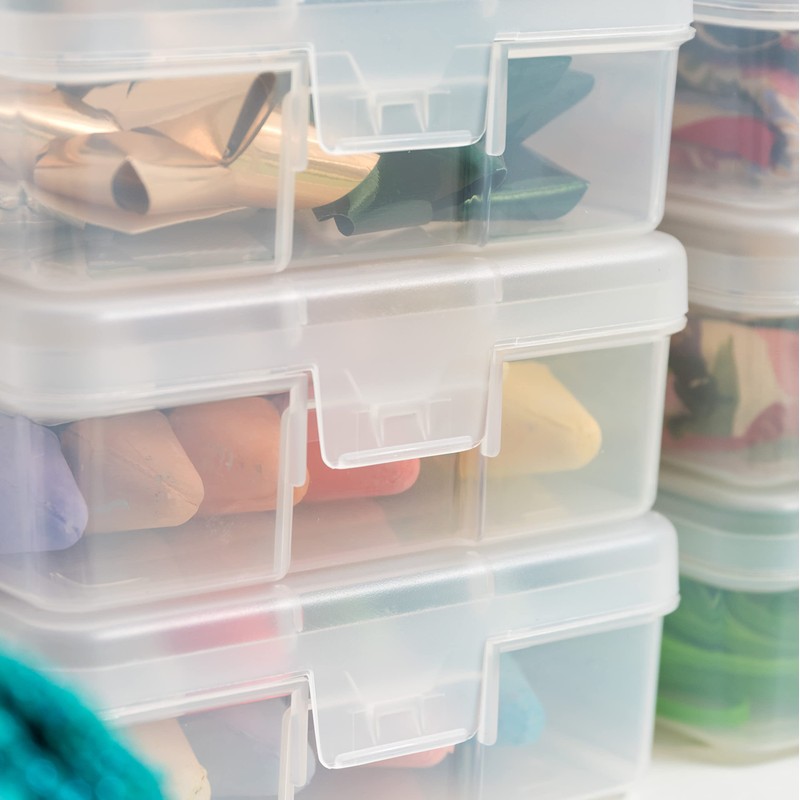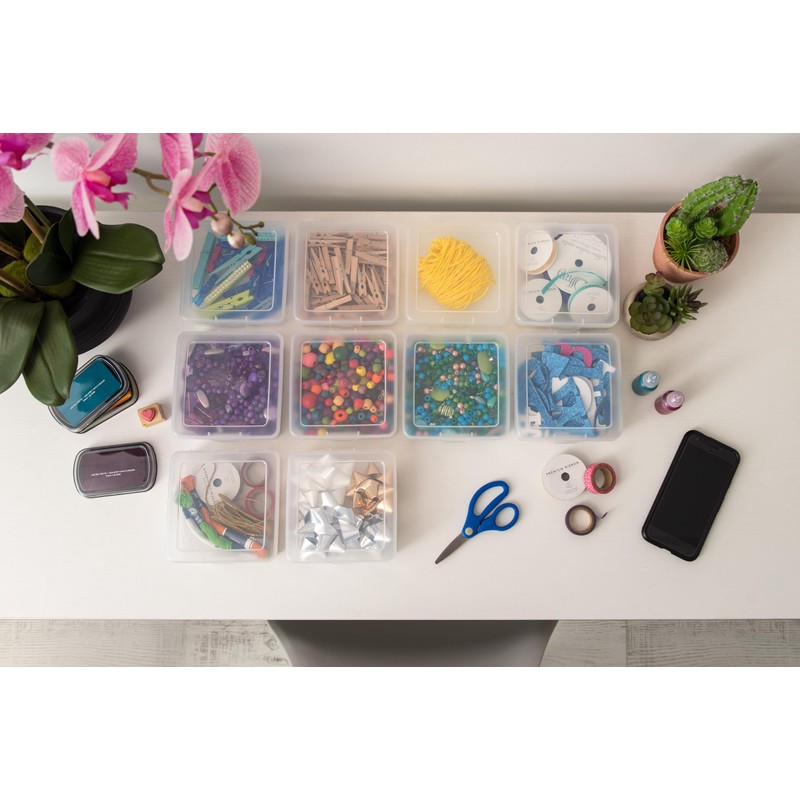 - ORGANIZATION SOLUTIONS - IRIS USA 18 Pack Plastic Clear Hobby Modular Craft Supply Art Satchel Storage Box Organizer with snap-tight closure latch help organizing stationary, documents, pens and crayons, small tool, card stock, embossing folders, and more