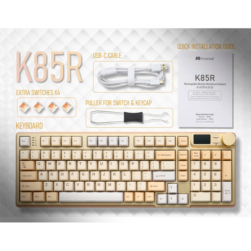 iRocks K85R Wireless RGB Backlit Mechanical Gaming Keyboard with LCD Display, Hot-Swappable Pre-lubed Switches, 98 PBT Keys, USB-C Detachable Cable (Light Golden, Silent Bubble Switch)