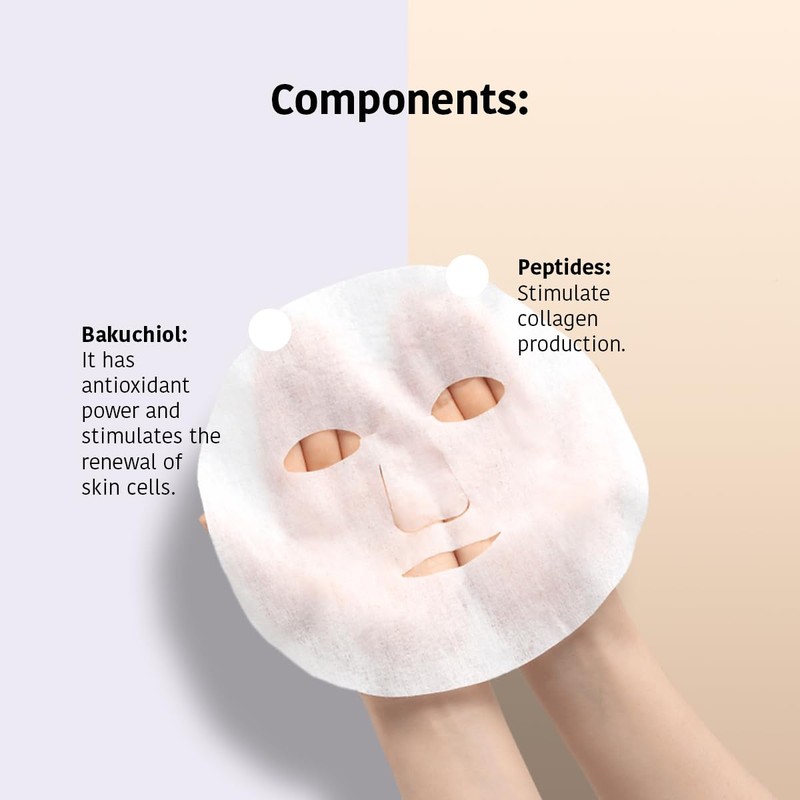- BAKUCHIOL FACIAL MASK: This is a firming and anti-aging mask with bakuchiol, a vegan plant-based alternative to retinol. It promotes cellular renewal and delays aging. It contains peptides that stimulate collagen production. This mask has been tested for efficacy and will show smoother skin with fewer expression lines in 28 days. Pack - Contains 5 pieces