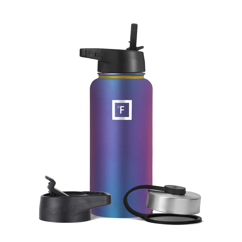 IRON °FLASK Camping & Hiking Hydration Flask, Wide Mouth, 3 Straw Lids, Stainless Steel Outdoor Water Bottle, Double Walled, Insulated Thermos, Metal Canteen - Aurora, 32 Oz
