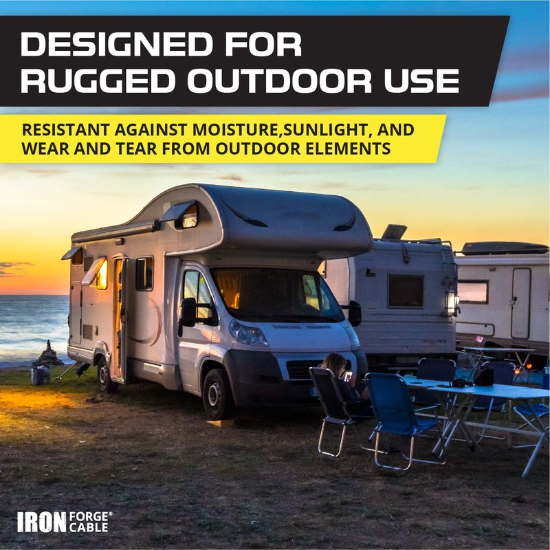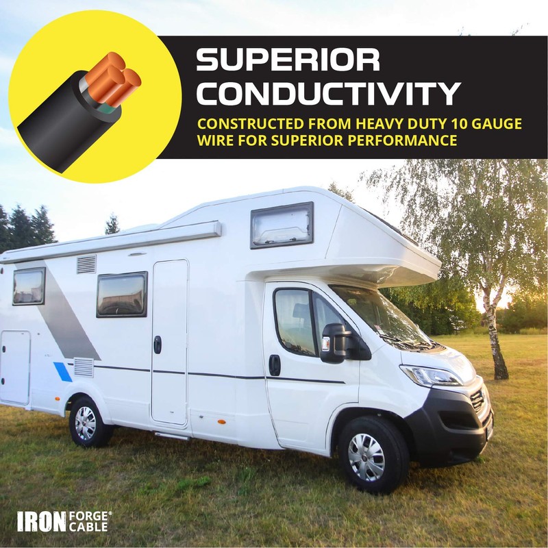 - SUPERIOR CONDUCTIVITY - Iron Forge Cable’s RV power adapter is constructed from a heavy duty 10 gauge wire main line connecting to two 12 gauge branch lines for superior conductivity.