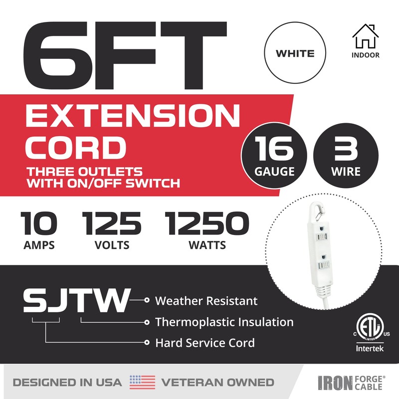 - ETL LISTED, VETERAN OWNED - 3 wire extension cord with switch on/off, 6 foot, 10 amp, 125V, 1250 watt. Temperature Range: -40°F to +140°F.