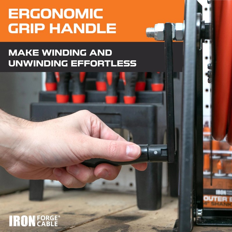 Keep your RV power cords neatly organized and easily accessible with the Iron Forge Cable RV Power Cord Reel, a heavy-duty cord storage reel designed for durability and convenience. Whether you need to roll up extension cord lengths of 50ft 50 AMP, 75ft 40 AMP, 100ft 30 AMP, or 200ft 15 AMP, this versatile extension cord storage reel ensures a hassle-free solution for managing your cables. Constructed from premium powder-coated black steel, it offers exceptional strength and stability, whether mounted on the wall or placed on the floor. The smooth ball-bearing spin mechanism and ergonomic grip handle make winding and unwinding effortless, preventing tangles and kinks for a seamless experience. More than just an extension cord wheel, this multipurpose cable spool can also be used for storing RV water hoses, ropes, and other essential gear, making it a must-have for campers, contractors, and homeowners alike. Engineered for longevity, its rugged frame stands up to daily use, providing reliable support for your power cords in any environment. As a U.S. veteran-owned company, Iron Forge Cable prioritizes quality and customer satisfaction, ensuring that you receive a top-tier product backed by dedicated service. Upgrade your cord management system with the Iron Forge Cable RV Power Cord Reel and experience the perfect blend of durability, efficiency, and convenience for all your storage needs.