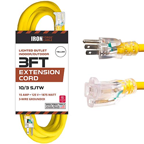 Iron Forge Tools 3 Ft Lighted Outdoor Extension Cord - 10/3 SJTW Yellow 10 Gauge Extension Cable