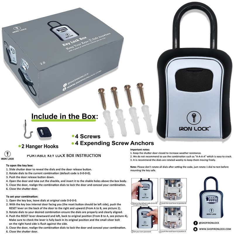 Iron Lock® - Key Lock Box Portable and Wall Mounted with Removable Shackle Indoor Outdoor Waterproof 4 Digit Combination with Resettable Code with A B Switch Key Lockbox for Outside Hold 5 Spare Keys