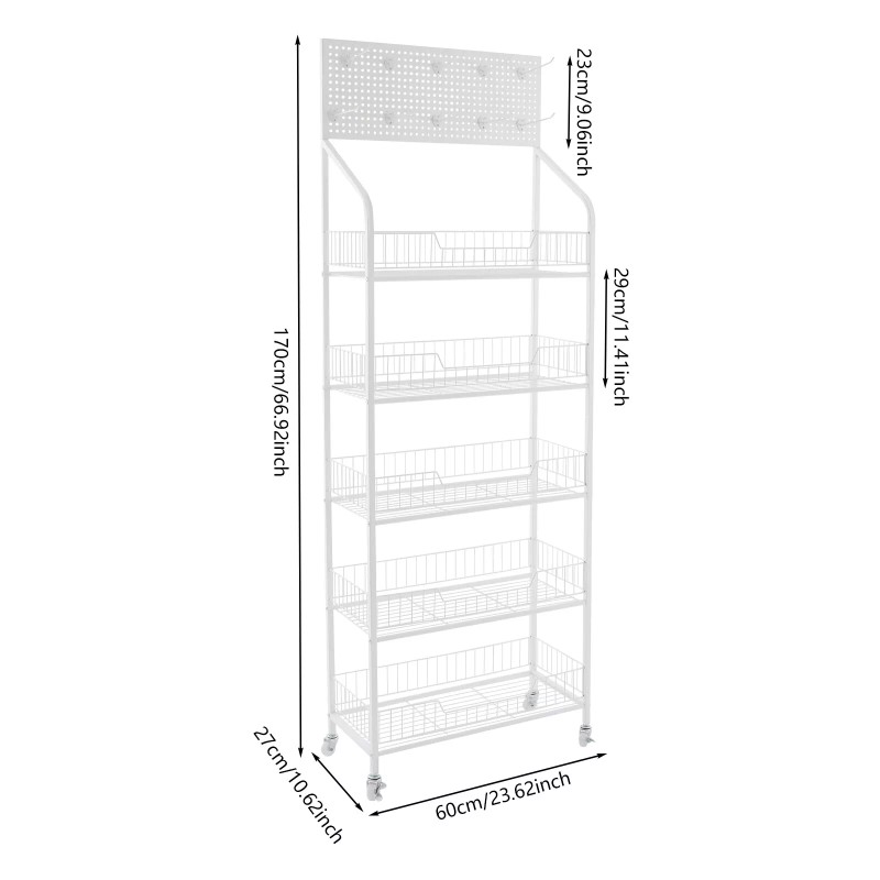 Material: Iron Process: Baking PaintStyle: ModernColor:WhiteShape: RectangularMount Type: Free StandingAssembly Required: YesNumber of Tiers: 5Number of Wheels: 4 (2 with Brakes)Each Tier Load-bearing Capacity: 20kg/44.09 lbsEach Hook Load-bearing Capacity: 1kg/ 2.2 lbsTier Spacing: 29 cm/11.42 inTop Hole Hanging Plate Height: 23cm/9.06 inProduct Size: 60*27*170 cm/23.62*10.63*66.93 inPackage Size: 146*28.5*7.9 cm/57.48*11.22*3.11inGross Weight: 9 kg/ 19.84lbsNet Weight: 8.55 kg/18.85 lbs