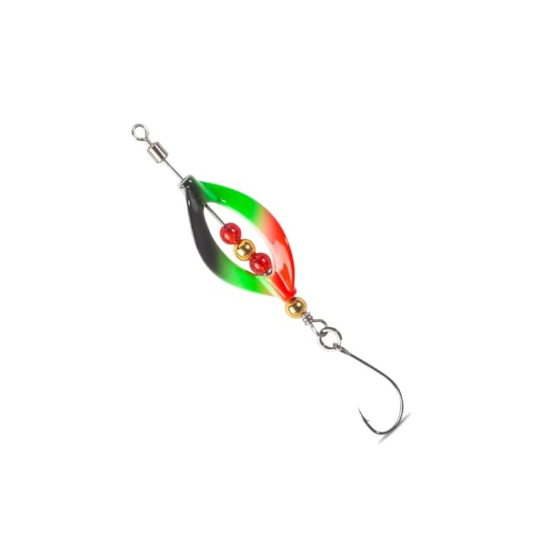 Iron Trout Swirly Loop Lure 2.8 g - Here are the ultimate whirlwinds from Zeck for the trout lake. This will also attract bite-lazy fish from the reserve. The Swirly lures run on a fixed axle, on which a swivel is already attached to the hanging side to avoid line twist. IT Swirly Loop and Swirly Leaf are made of zinc material and thus pose no risk to the environment.