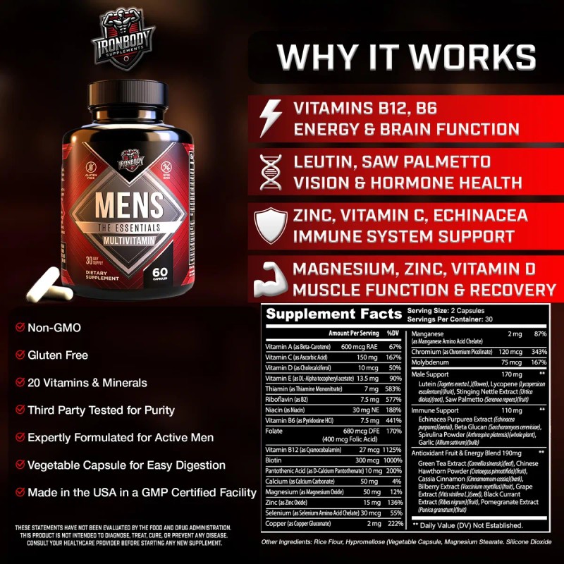 IronBody Supplements - Ironbody Multivitamínico Para Hombres - 60 Cápsulas. 💯 Autenticidad y máxima durabilidad comprobadas. Tecnología avanzada y rendimiento superior. ⭐ Miles de reseñas positivas. Ideal para quienes buscan lo mejor en calidad y estilo. Producto auténtico con satisfacción total asegurada. ¡No te quedes sin el tuyo y aprovecha esta oportunidad única!