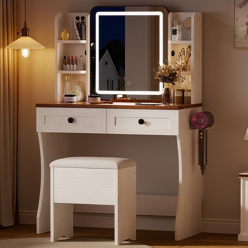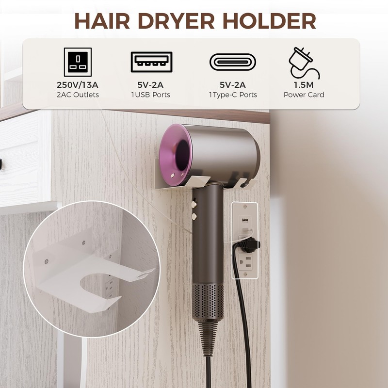- Built-in Charging Station & Holder: The vanity desk is equipped with a built-in charging station featuring 2 outlets and 1 USB port for powering your devices. A convenient side-mounted hair dryer holder keeps your styling tools organized and easily accessible, enhancing the functionality of your vanity with storage.