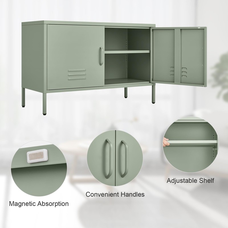 - 【Uniqe Designs】This green metal accent cabinet is designed with air vent holes for proper air ventilation,adjustable non-slip feet to adapting to uneven floor,Console cabinet with doors adds extra space,and protects your items from light exposure,dirt and dust.