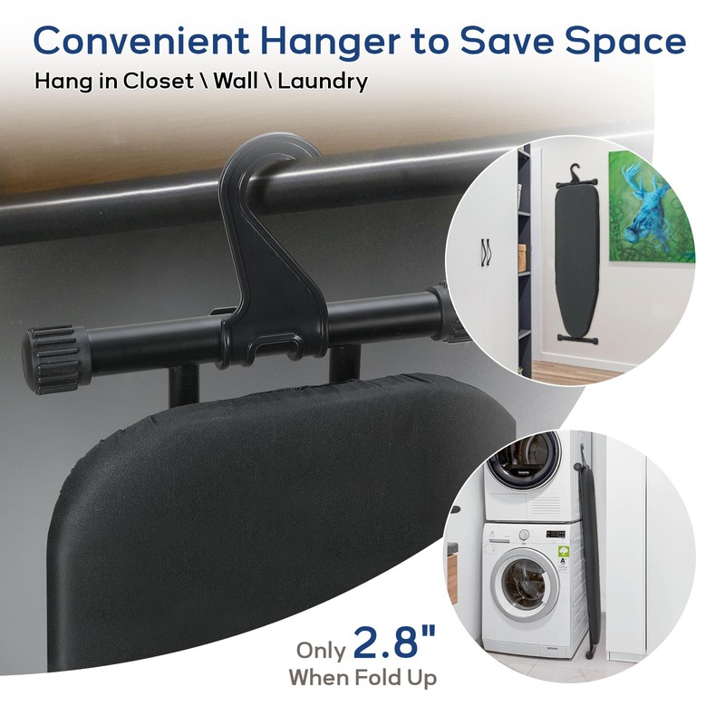 - Smart Closet Hanger: With the equipped hanger, you can hang the ironing boards on a wall, closet, laundry room or even behind a door in your house. The safety lock will prevent the board from opening accidentally