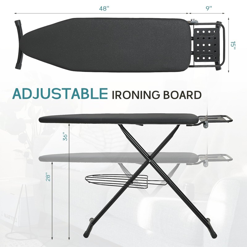 - Ironing Board Full Size: Our 48"x15" large ironing board is perfect for home use, with multiple height settings, it easily accommodates users of different heights. Stable and long-lasting construction to make your ironing experience more comfortable