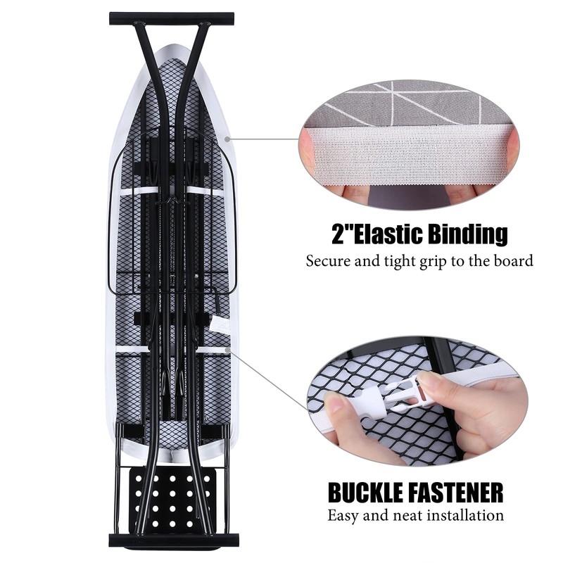 - ★ ELASTICIZED SKIRT : Our ironing board pad designed for standard board to 54x15 inch. With the 2 inch wide elastic edge for firm grip, easy installation and adjustment.