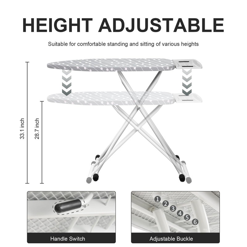 - Adjustable Height: There are 6 buckles under the iron board, representing the ability to adjust 6 different heights, and there is also a switch handle next to it for auxiliary locking.The steel tube frame allows you to adjust the height of compact ironing board from 28.7 to 33 inches, accommodating users of various heights.