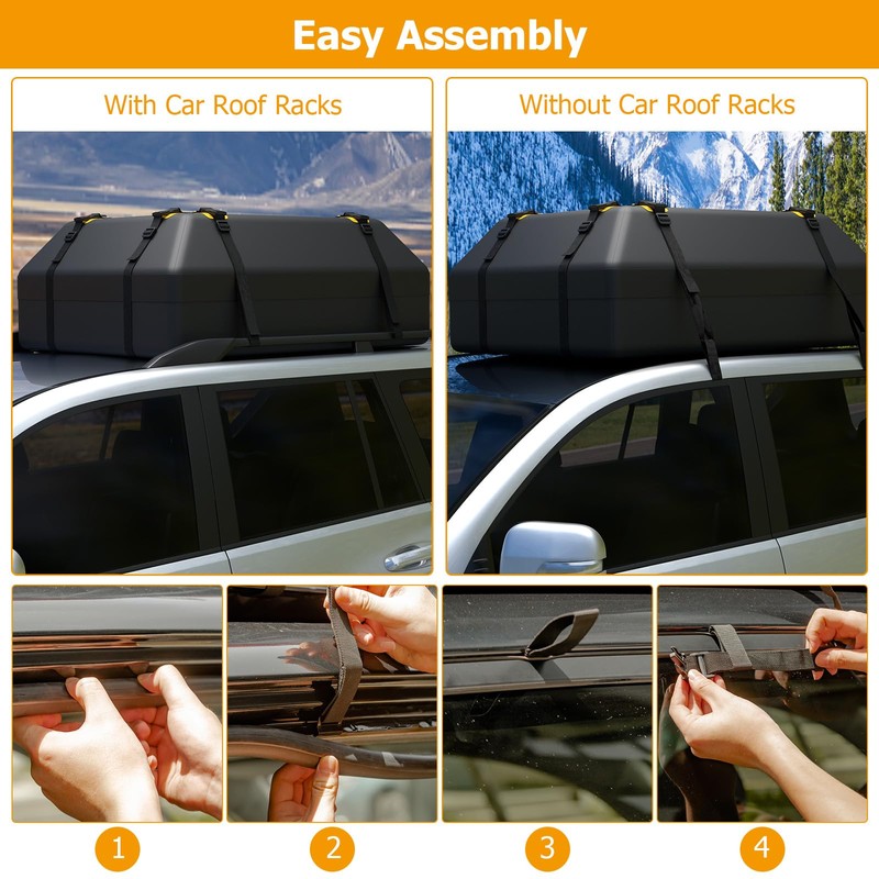 - EASY TO INSTALL AND LOAD: The car top carrier is suitable for most vehicles, such as SUV, sedan, hatchback, off road vehicle and pickup, but also easily to be mounted on vehicles without roof rack and with cross bars, side rails and basket.