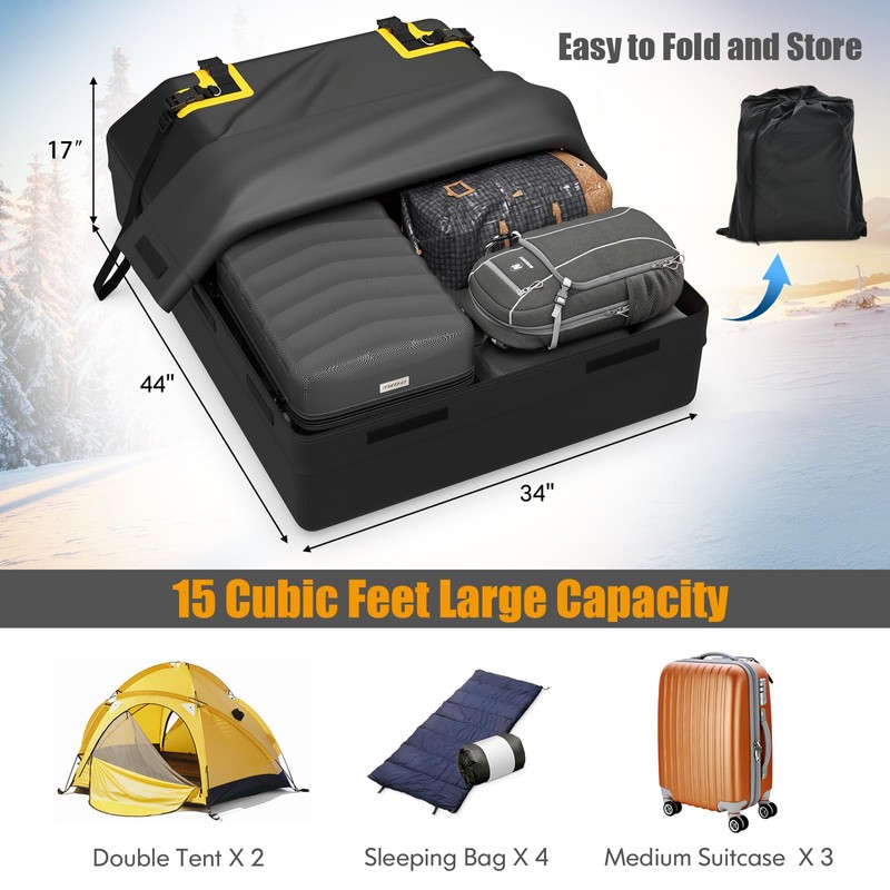 - 15 CUBIC FEET LARGE CAPACITY: The large capacity 15 cubic dimensions (44’’L x 34’’W x 17’’H) can accommodate a family's luggage (3 medium suitcases or 2 double tents), freeing up space in the back seat of the car and making the journey easier and more comfortable.