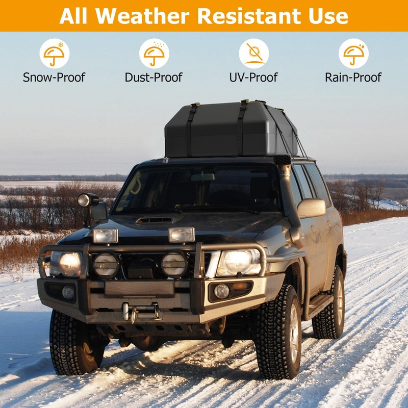 - 840D 3-LAYER WATERPROOF PVC: Made of high-quality, tough 840D PVC fabric, our cargo carrier bag provides 100% waterproof protection, securely protecting your cargos. And the widened rain curtain with touch fasteners can easily block heavy rain, strong wind, and dust.