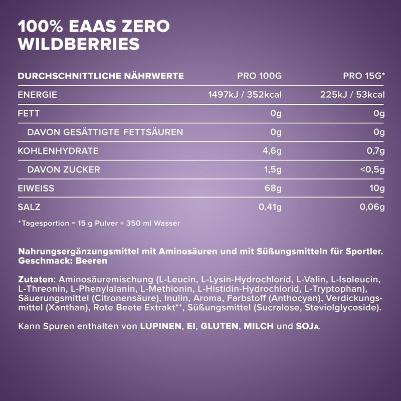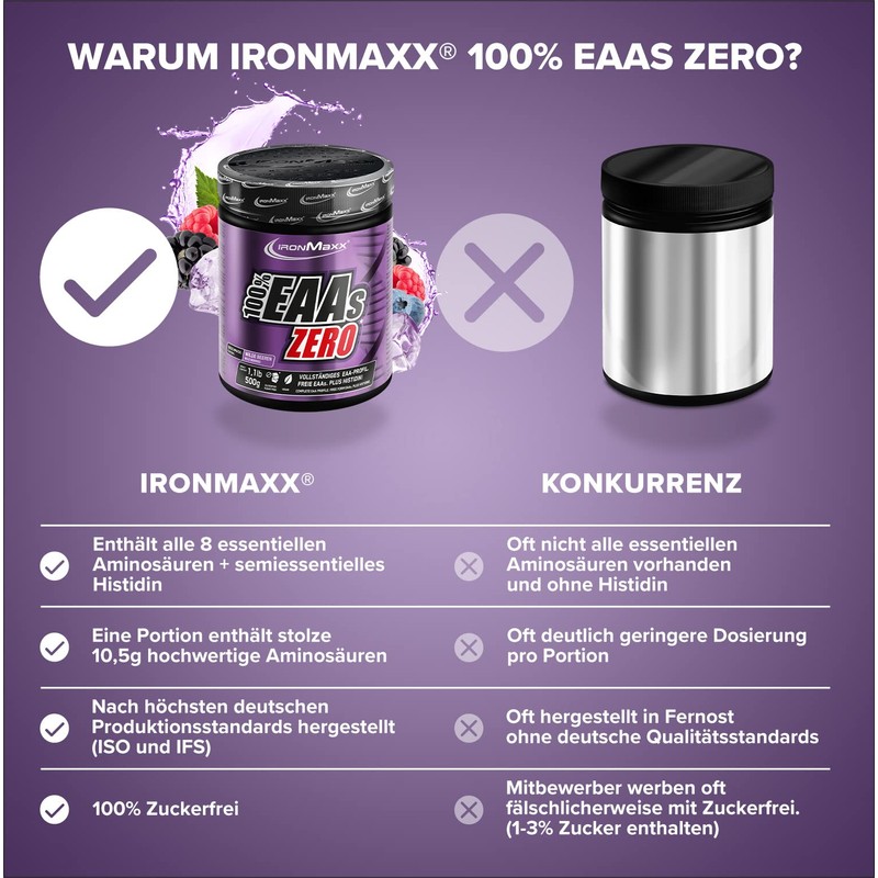 - Box contents: 1 x 500 g IronMaxx 100% EAAs Zero Wildberry - pure EAA amino acid powder. For performance enhancement, cell protection and strengthening of the immune system - the all-rounder from IronMaxx.