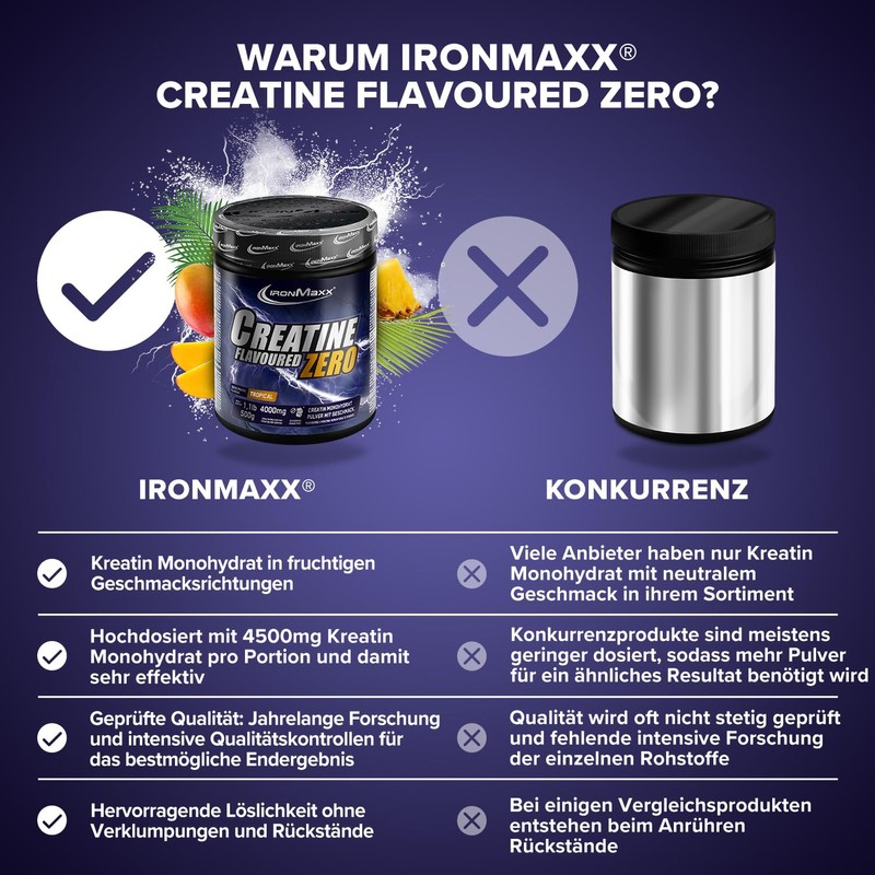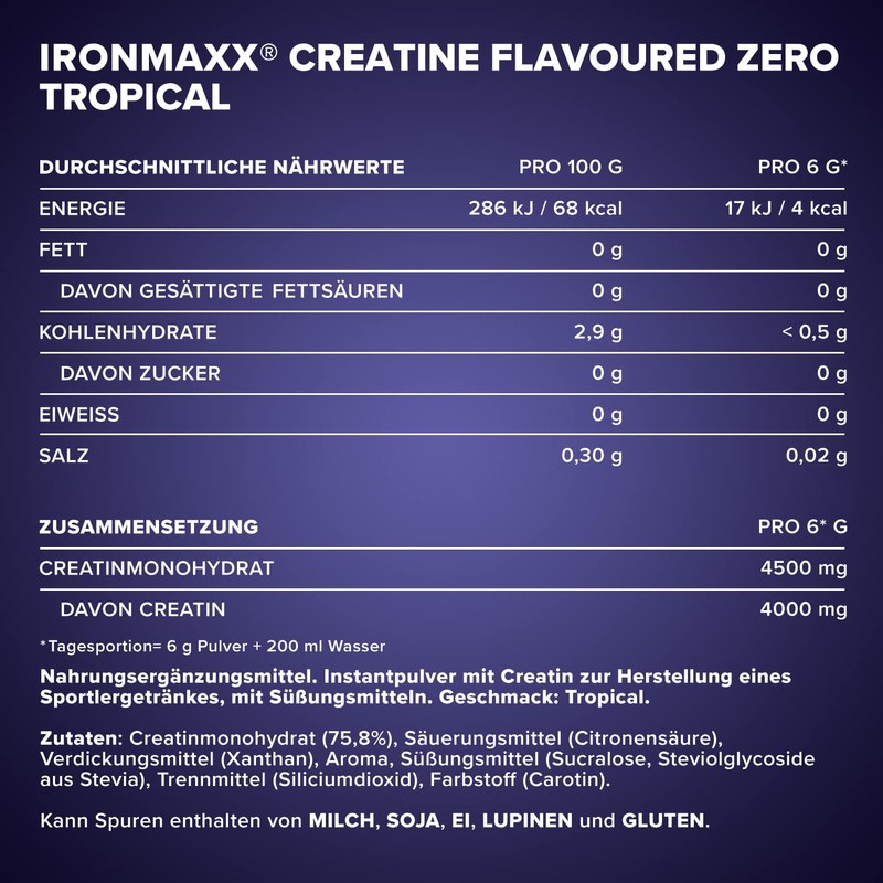 ProduktbeschreibungIronMaxx Creatine Flavoured Zero Der Creatine Flavoured Zero hilft Dir, Dich auf Dein Workout ideal vorzubereiten. Die optimal aufeinander abgestimmten Stoffe sorgen fr eine intensive Wirkung. Eine Supplementierung mit Creatine Flavoured als wasserl?sliches Getr?nk liefert dem K?rper schnell verfgbare Energiereserven. So steht ein schwei?treibendes Muskeltraining nichts mehr im Weg. Bestehend aus reinem Kreatin Monohydrat enth?lt der Kreatin-Drink weder Kohlenhydrate, Zucker oder knstliche Zusatzstoffe. Verfgbar ist er in 2 verschiedenen Geschmacksrichtungen und l?sst dir so die Qual der Wahl mit welchem Geschmack du in ein optimales Training starten willst. Zubereitung und Verzehrempfehlung 6g Pulver (1/2 gestrichene Essl?ffel) und 200ml kaltes Wasser in den Mixbecher geben und 20 Sekunden lang stark schtteln Trinken Sie eine Portion Creatine Flavoured Zero direkt vor dem Training. Die angegebene empfohlene t?gliche Verzehrmenge darf nicht berschritten werden. Nicht als Ersatz fr eine ausgewogene und abwechslungsreiche Ern?hrung verwenden. Lagern Sie dieses Produkt au?erhalb der Reichweite von kleinen Kindern. Vor W?rme, Feuchtigkeit und Sonneneinstrahlung geschtzt aufbewahren.IronMaxx - die Nummer 1 in Sachen Bodybuilding, Fitness, Di?t und Gesundheit.Ganz nach dem Motto: "Sportern?hrung muss wirken und Sportern?hrung muss schmecken." entwickelt IronMaxx zukunftsweisende und innovative Sportnahrung in h?chster Qualit?t.Besonders im Bereich von Proteinpulver konnte IronMaxx in den letzten Jahren mit der Entwicklung von Proteinpulvern auf Wasserbasis gro?e Erfolge erzielen. Das Sortiment von IronMaxx umfasst nicht nur Produkte in Pharma- und Bioqualit?t, sondern auch Produkte auf der K?lner Liste. So hilft IronMaxx jedem Sportler, seine individuellen Ziele zu erreichen.Inhaltsstoffe / ZutatenCreatinmonohydrat, S?uerungsmittel (Citronens?ure), Verdickungsmittel (Xanthan), Aroma, S?ungsmittel (Sucralose und Steviolglykoside), Trennmittel (Siliciumdioxid), Farbstoff (Beta-Carotin).Gebrauchsanweisung6g Pulver (entspricht ca. ? Essl?ffel) und 200g kaltes Wasser in den Mixbecher geben und 20 Sekunden lang schtteln. Empfehlenswert ist eine Portion am Tag.WarnhinweiseKann Spuren enthalten von: Lupine, Ei, Soja, Gluten und Milch.Rechtliche HinweiseHinweis Creatin: Nicht fr Kinder und Jugendliche Stillende und Schwangere geeignet! Die Zufuhr von Kreatinmonohydrat kann durch vermehrte Wassereinlagerung in der Muskulatur zu einer Gewichtszunahme fhren. Kann Spuren enthalten von: Lupine, Ei, Soja, Gluten und Milch.Anschrift Hersteller/ImporteurIronMaxx Nutrition GmbH & Co. KG, Wegelinstr. 15, 50354 Hrth, Deutschland