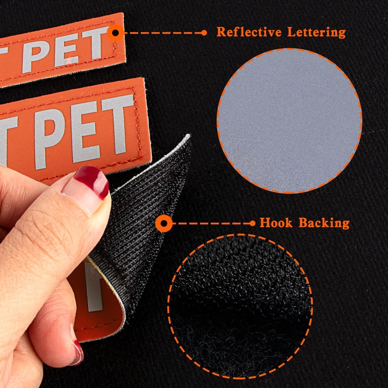 - Set of 2 Patches: lets you clearly identify your dog on both sides of his harness or vest. (SERVICE DOG/ASK TO PET/DO NOT PET/FREE HUGES/EMOTIONAL SUPPORT/SERVICE DOG IN TRAINING)