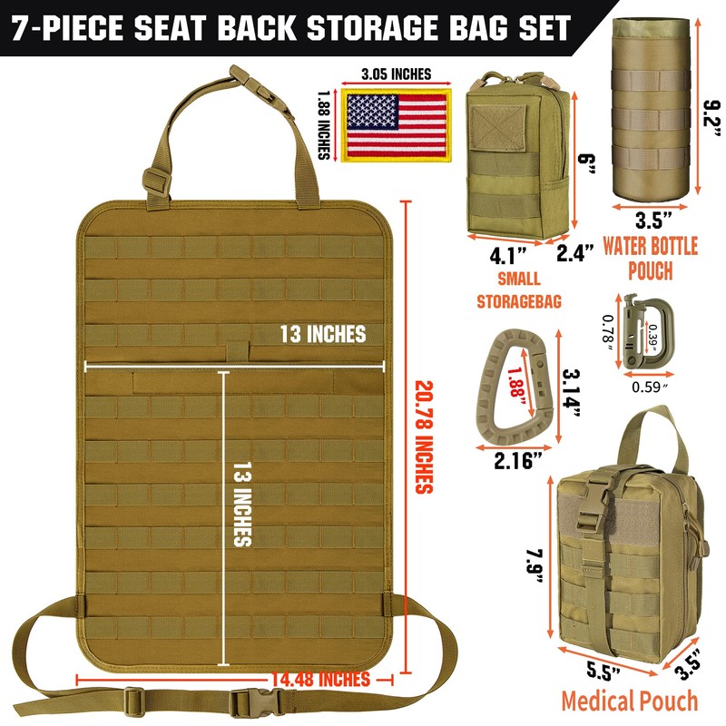 IronSeals Car Seat Back Organizer with 4 Pouches, Tactical Molle Panel Sag Proof Vehicle Seat Protector Automotive Seat Back Pad - Duffel Bag, Medical Pouch, Water Bottle Pouch and Molle Pouch