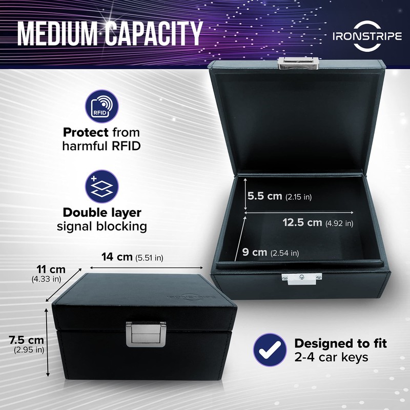 - YOUR ALL-PURPOSE ANTI THEFT CAR KEY BOX – Keep your most valuable possessions protected by blocking signals and PREVENTING VEHICLE THEFT! Place your keyless car key fobs inside this faraday key box, and you’ll never need to worry about SIGNAL HACKING again. Our Medium-Sized car key fob protector is designed to hold 2–4 CAR KEYS, with a 7.5 x 11 x 14cm exterior, and 5.5 x 9 x 12.5cm interior.