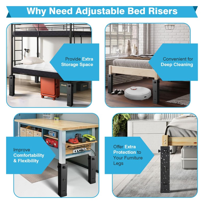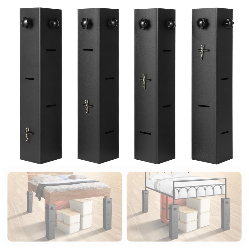 - 【Easy Installation】No drilling or extra tools are needed! Simply choose your desired height, insert the support plate, place your bed on the risers, and secure with the locking screws. Enjoy your newly created storage space in no time!