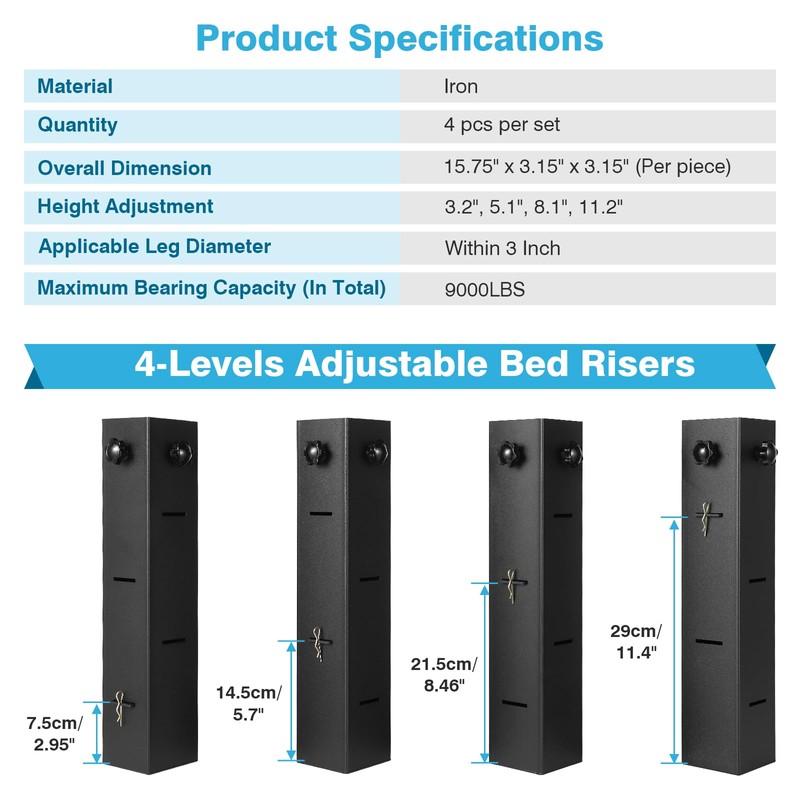 - 【4 Versatile Height Options】The IRONWALLS bed lift risers feature four adjustable height settings—11.2", 8.1", 5.1", and 3.1". Easily customize your bed height to maximize storage space or simplify cleaning, making them perfect for dorm rooms or small spaces.