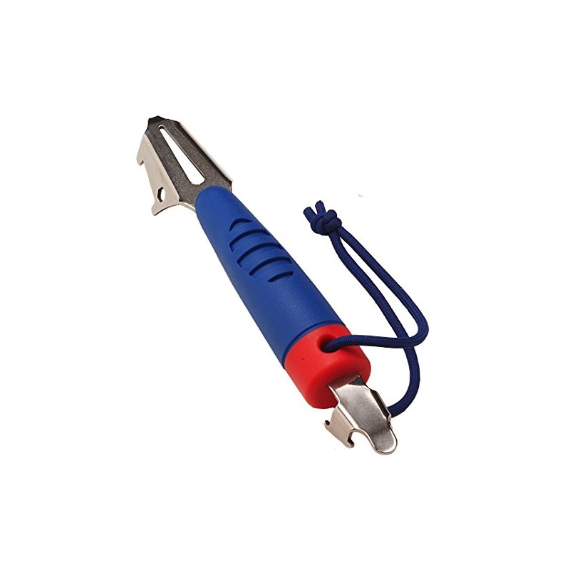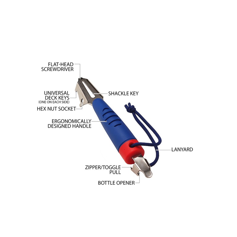 - PROVIDES 6 ESSENTIAL FUNCTIONS - Two stainless steel blades do the work of 6 different tools: boat shackle key, two universal deck plate keys, flat-head screwdriver, 1/4 hex head driver, zipper/toggle pull, and bottle opener