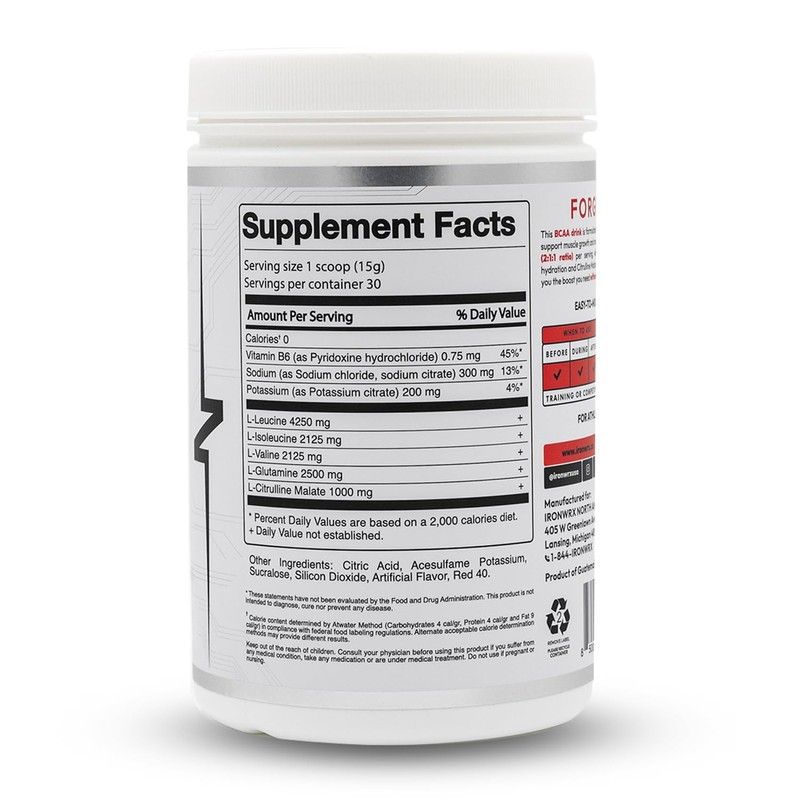 IRONWRX BCAA Powder | Watermelon Flavor | 30 SERVINGS | Zero Sugar | 2:1:1 Leucine, Valine, and Isoleucine Ratio with Citrulline Malate and L-Glutamine | Muscle Growth, Recovery, and Soreness Support