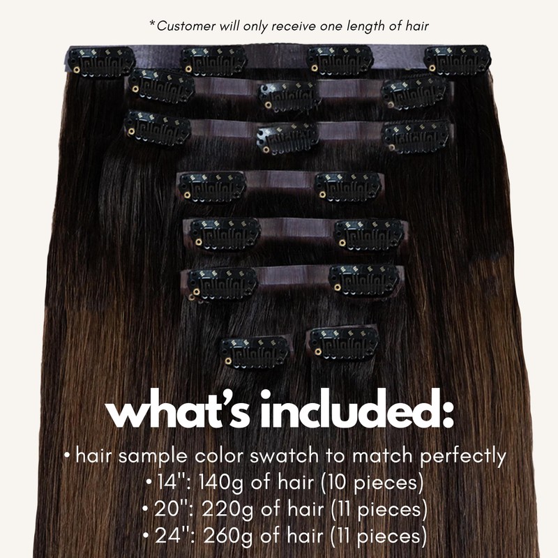 - DIFFERENT LENGTHS AND WEIGHTS FOR CUSTOM USE + EASY CARE – Each set of clip on extensions human hair comes with a range of weft sizes for coverage based on your needs. The 14" set includes 100g of hair (7 pieces), the 20" set has 160g (8 pieces), and the 24" set offers 200g (10 pieces). CARE: Brush before & after each use, starting at the ends and working up. Wash only when needed using a gentle sulfate-free shampoo, then let air dry. Always use a heat protectant before styling.