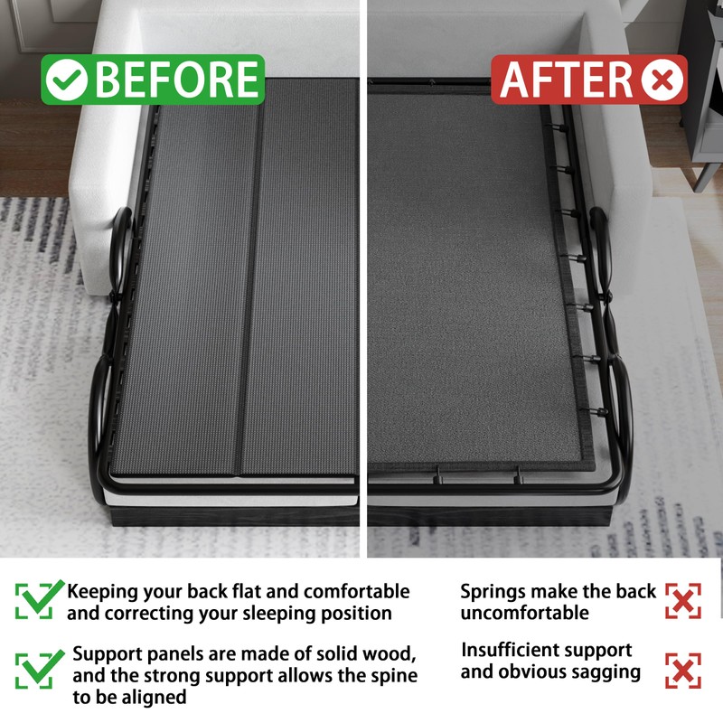 • Sofa bed new experience:Older sofa beds are supported by bottom springs and fabrics, and you can feel the discomfort and lack of support from the back springs while sleeping.Sofa bed support boards can be a good solution to this problem! Simply place it on top of the sofa bed to solve the problem of sagging and springs due to insufficient support and improve the quality of sleep.