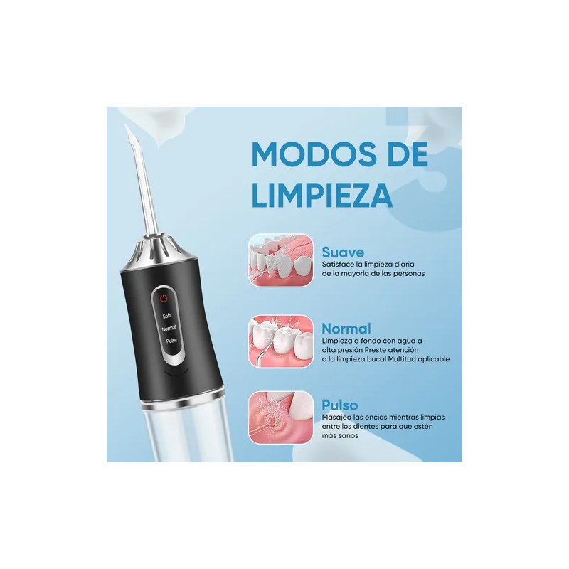 El irrigador dental de agua limpia profundamente, masajea las encías y previene problemas como manchas, mal aliento y acumulación de placa.