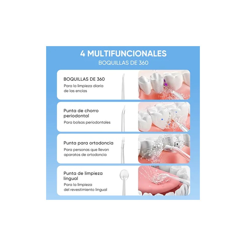 🔁 Boquillas intercambiables para usos variados: estándar, ortodoncia, lengua, etc.