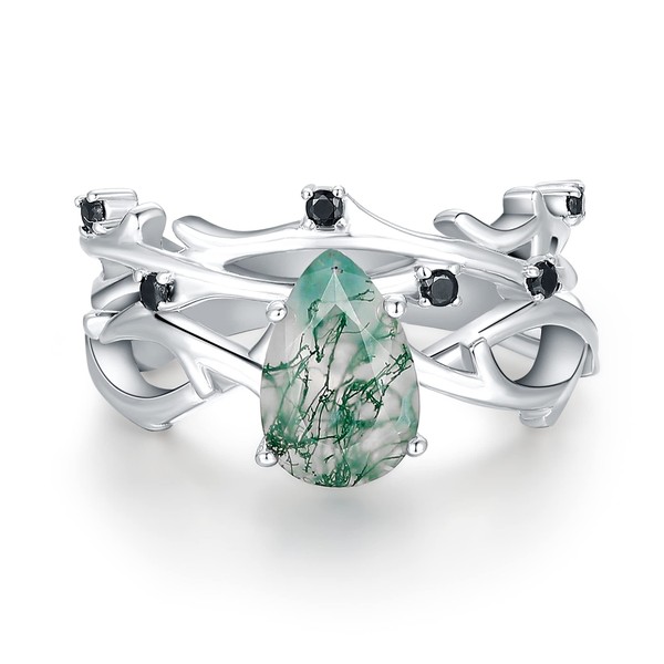- ♕【About The Gems & Ring Band】Accent by 0.09 carats Round Cut Created Black Spinels, This ring is 4-Prong center set with VS Excellent Pear Cut 6x9mm 1.50 Carats Natural Green Moss Agate! And the band of 1.65mm Width main ring + 1.50mm Width second ring are Handmade in solid Platinum plated real 925 sterling silver to ensure long-lasting shiny luster. No worry about stones falling out or ring band tarnish! 100% Allergy-free!