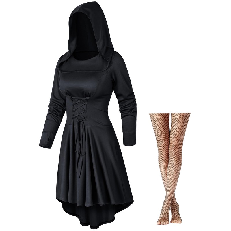 Irtysh Womens Base Vintage High Low Pullover Medieval Hooded Robe Cloak Dress Costumes Cosplay Net Leggings Set(Black S)