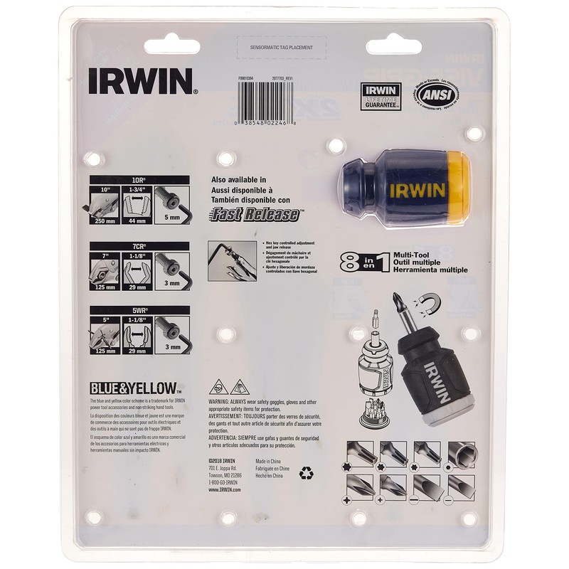 IRWIN Tools 2077703 Vise-Grip Original Locking Pliers Set, 3-Piece with Bonus 9-in-1 Multi-Tool Screwdriver, includes the 10R 10" straight jaw locking plier, 7CR 7" curved jaw locking plier, 5WR 5" curved jaw locking plier with wire cutter, and 9-in-1 Multi-Tool Screwdriver. IRWIN Vise-Grip manufactures its pliers with high-grade, heat-treated alloy steel for maximum toughness and durability. The pliers meet or exceed ANSI specifications. This IRWIN Vise- Grip Original Locking Pliers Set comes with a lifetime guarantee.