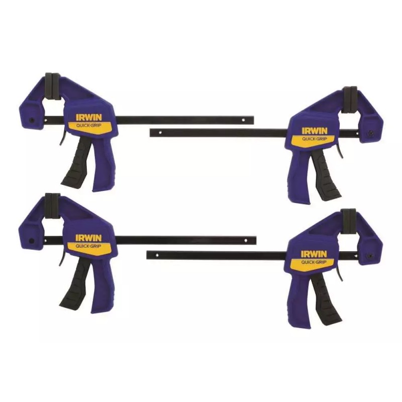 Whether you're holding a piece of wood for sawing or drilling or positioning material temporarily, the IRWIN QUICK-GRIP Bar Clamp 6-Inch Mini Buy 2, Get 2 lets you do so securely. For added safety and ease of use, they feature a Quick-Release trigger that let you clamp using only one hand. The Irwin bar clamps exert as much as 150 pounds of clamp pressure to keep your materials in place while you glue, drill or saw. Their removable non-marring pads protect surfaces as you work. Designed with a pistol grip, the quick-grip bar clamps are comfortable to use. They're also 25 percent smaller than most Quick-Change clamps to let you handle work in small spaces or use them with smaller materials. IRWIN QUICK-GRIP 4-Pack of 6-in clamps is ideal for securing materials for sawing, drilling and positioning work for fastening One-handed Quick-Release trigger offers easy, one-hand operation Non-marring pads grip firmly and protect your work