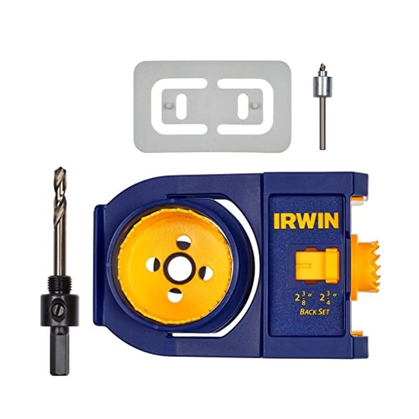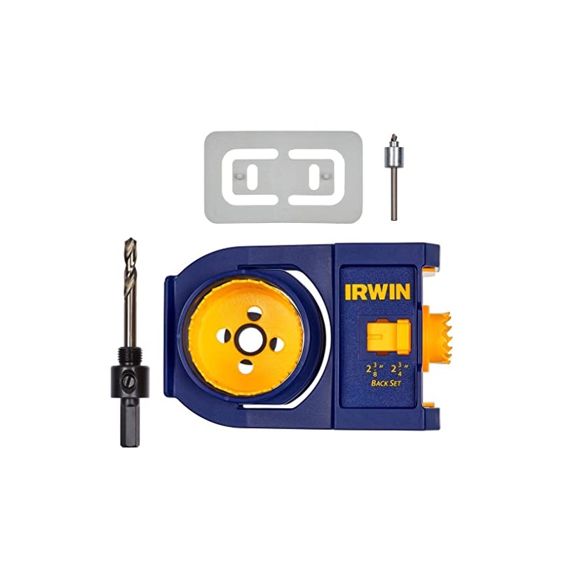 The Irwin Metal and Wood Door Lock Installation Kit includes a double-sided jig, two bi-metal hole saws, a 3/8-inch mandrel, a bolt plate template, custom router bit, hinge plate template, and nylon bag to store all the parts. It fits all interior and exterior doors and lets you install locks in three simple steps. The self-centering jig fits common door widths and can be adjusted to fit 2-3/8 inch or 2-3/4 inch backsets.