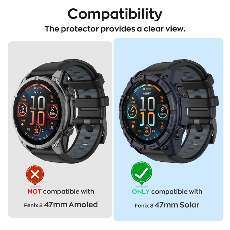 - Note: This watch case compatible with Garmin Fenix 8 47MM Solar watch(NOT fit for Fenix 8 47MM AMOLED)..