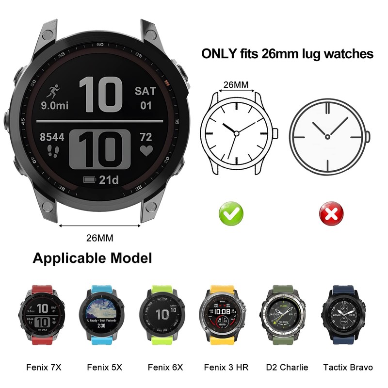 - Compatibility: QuickFit 26 mm watch strap is perfectly compatible with Fenix 7X, Fenix 6X, Fenix 6X Pro, Fenix 5X Plus, Fenix 5X, Fenix 3, Fenix 3 hr, Descent MK, D2 Delta PX, D2 Charlie (replacement straps for men and women only, watch not included).