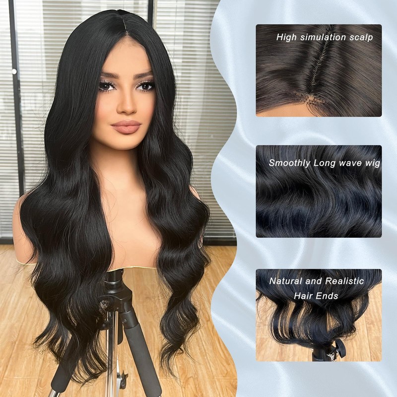ISAMY Long Wavy Wigs for Women 26Inch Synthetic Middle Part Curly Wavy Natural Looking Synthetic Wig for Daily Part Use (Black)