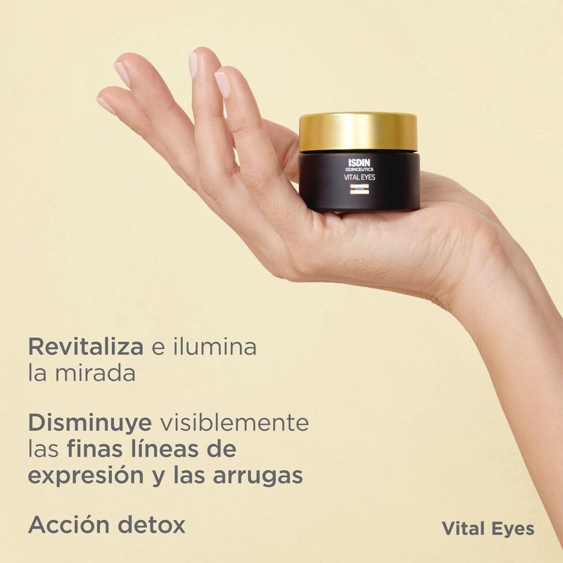 Revitaliza tu mirada con ISDIN Isdinceutics Vital Eyes, una crema de contorno de ojos anti-edad con tecnología avanzada y potentes ingredientes como melatonina, cafeína, extracto de arroz y algas. Su fórmula ligera reduce líneas de expresión, arrugas y signos de fatiga en tan solo 28 días. Ideal para piel mixta y apta para uso diario, mañana y noche.