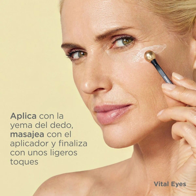 Vital Eyes es una crema reparadora para el contorno de los ojos con melatonina y cafeína que ayuda a suavizar las líneas de expresión y las arrugas. Sus ingredientes estimulan las defensas antioxidantes de la piel y aportan una acción detox. El aplicador de Vital Eyes proporciona un efecto frío que ayuda a descongestionar la zona y refrescar la mirada. Resultados visibles en solo 28 días.